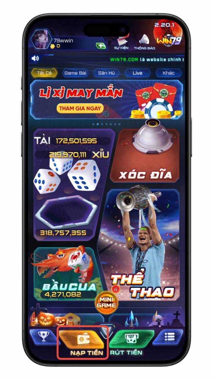 Tại giao diện chính cổng game Win79, bạn bấm NẠP TIỀN
