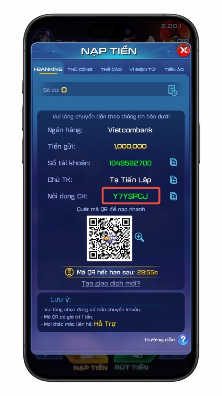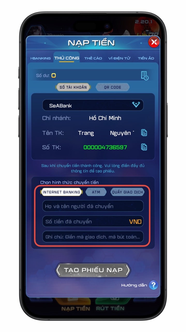 Bạn chuyển tiền Internet Banking qua thông tin Win79 cung cấp.