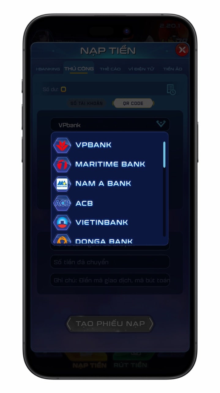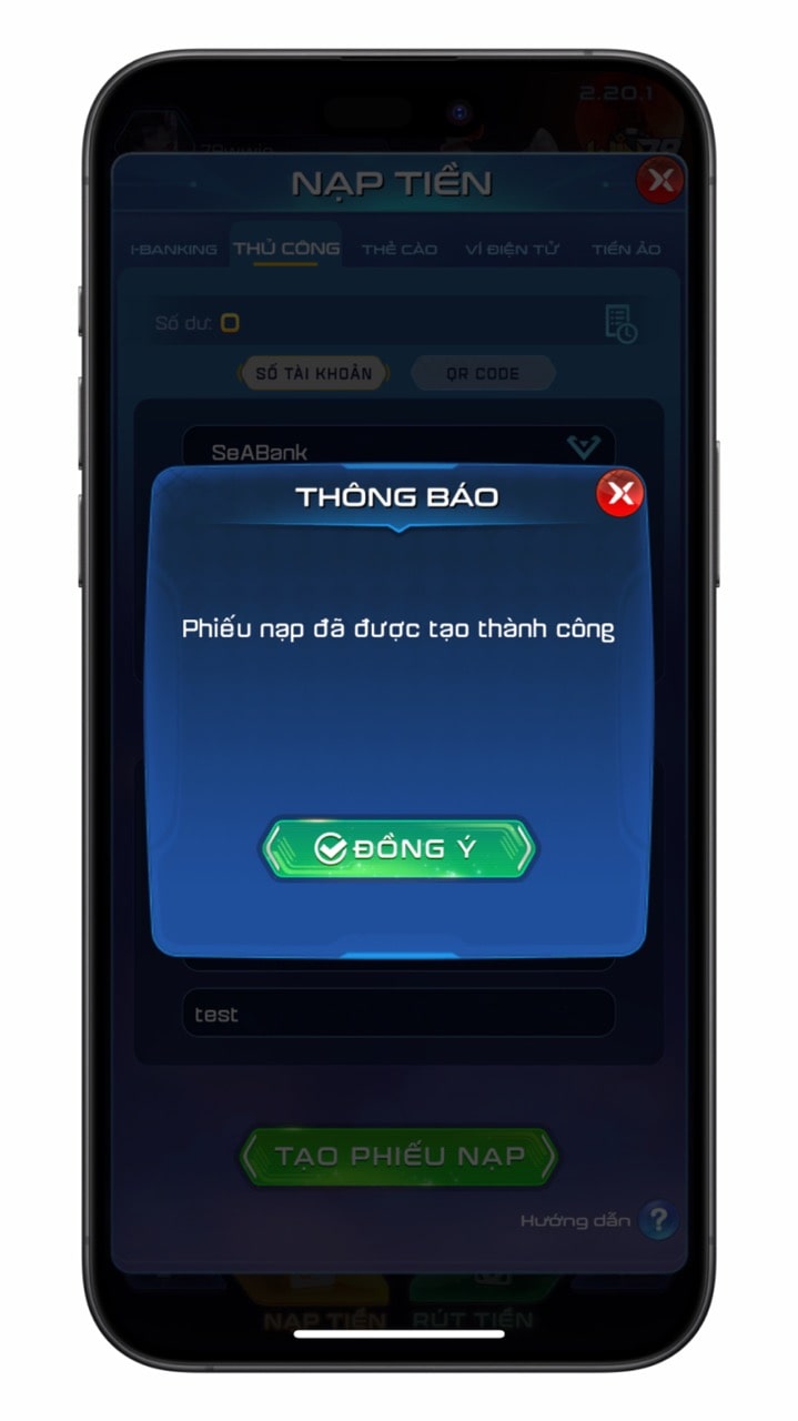 Tạo phiếu nạp sau khi bạn đã chuyển tiền thành công.