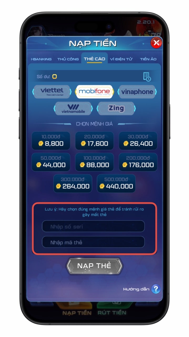 Bước 2: Chọn loại thẻ cào và mệnh giá tương ứng.
