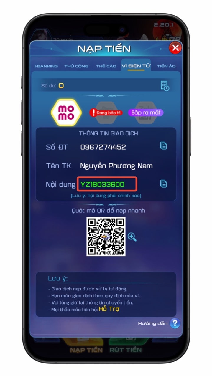 Bước 2: Chọn ví điện tử momo, lúc này hệ thống Win79 sẽ xuất hiện thông tin/ mã QR tài khoản nhận để bạn chuyển tiền vào.