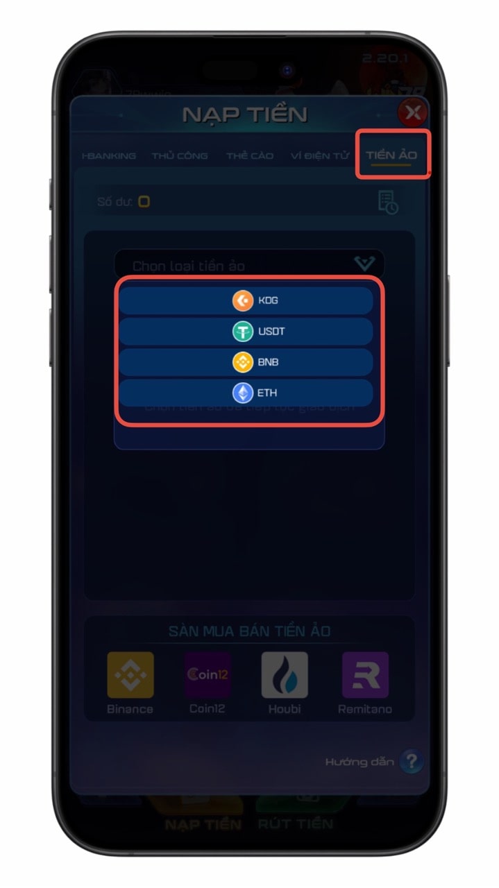 Tại mục NẠP TIỀN, bạn chọn vào ô TIỀN ẢO.