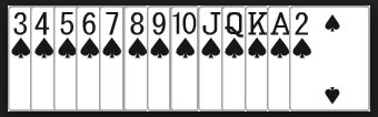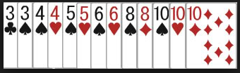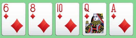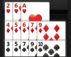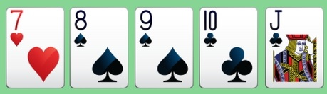 - Sảnh (J♠ 10♦ 9♥ 8♣ 7♥): Chi này bao gồm 5 lá bài tạo thành một dãy liên tiếp, không quan tâm đến chất của các lá bài.